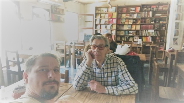 Ya a punto de dejar atrás el mercado, echaron un último vistazo general, el diverso colorido de todo lo que los rodeaba era impactante. Seguramente nunca lo olvidarán. Subieron algunas calles y entraron a una cafetería cultural muy pequeña y particular. Sus muros están cubiertos de libros acomodados prolijamente en bibliotecas. Uno puede escoger un libro y leer mientras disfruta de algo rico para comer. Es moneda corriente que Juani, junto a los de Siete Vueltas pasen en cada viaje, al menos, unas horas disfrutando de la lectura y el café. Con algunos títulos bajo el brazo y siendo ya el mediodía partieron con destino al “Fondito” porque la parrilla “Los Puestos”, con su gran cardón y su tradicional colorido cartel, estaba cerrada.