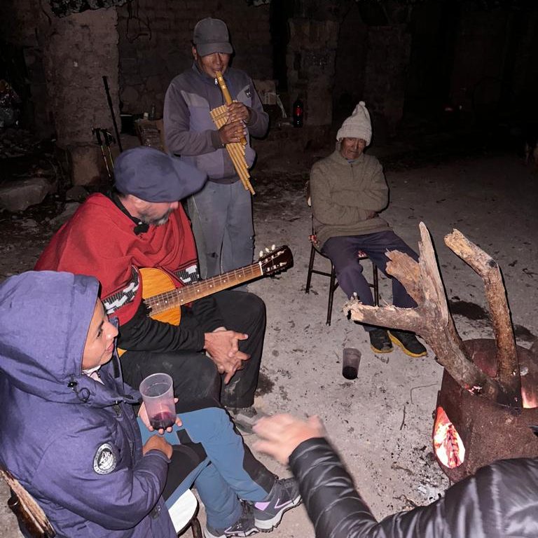 Por la noche recibieron visitas. Chabelo, Felipa, los maestros y la directora aportaron ingredientes para improvisar una picada y pizzas a la parrilla, acompañados de carnosos y coloridos choclos. Por supuesto, el fuego, la guitarreada y los vientos de Carlitos estuvieron presentes hasta altas horas de la noche. Canciones como Huayayay y la de la Suegra quejosa fueron reiteradamente solicitadas por Juani y Serhiy. El rito de compartir hace más amena la estadía en lugares donde la soledad abruma. Un enorme chocolate circula entre las manos de todos y termina de endulzar el encuentro.