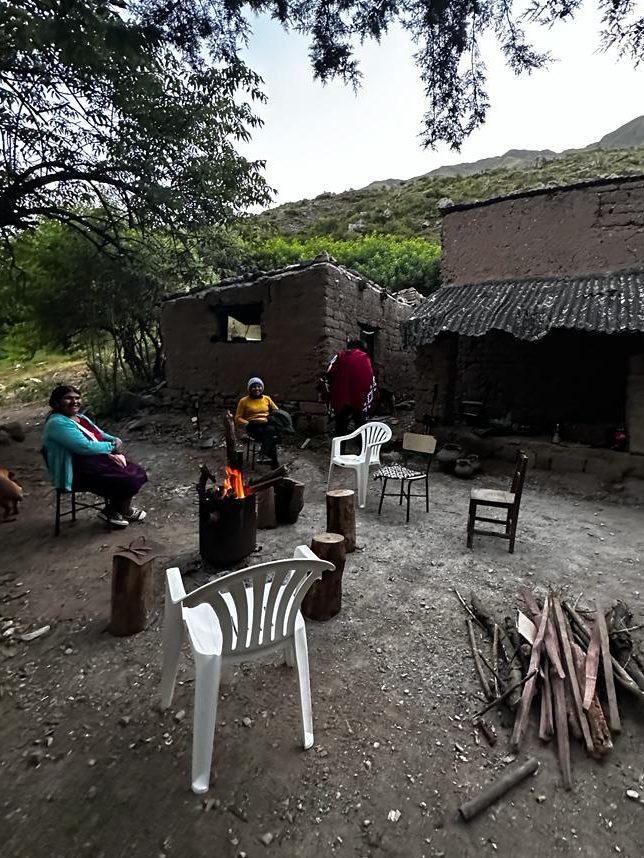 Ingresando a la casa los espera un cordial cartel de bienvenida. Siempre están en esos detalles que llenan el corazón. La pequeña cocina en la que un fuego interior calienta la grasa donde se cuecen las más sabrosas tortafritas es de lo más pintoresca. De techo bajo, puerta pequeña y teñida por el oscuro tizne le aportan un ambiente especial. Colgando sobre sus cabezas unos pequeños sacos contienen sal y especias que se ahumarán con el paso del tiempo y sirven de condimento para sus comidas. El humo del interior apenas les permite verse las caras y respirar. Pegado al sartén el cordero hecho al ras del suelo en una parrilla a la que le faltan más varillas que con las que cuenta inunda de un exquisito aroma el lugar.