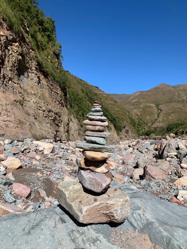 La tarde estaba libre de planes y decidieron bajar a la rocosa playa. La fuerza del agua es ensordecedora, aún en los meses que el caudal no está en su máximo esplendor. El grupo parecía haber rejuvenecido y, libre de responsabilidades, Ale y Serhiy competían construyendo apachetas. Por supuesto, la más alta ganaría. El ganador de esta treta nadie lo conocerá debido a que la diversión se centró en voltear la torre de piedras del contrincante. Esta situación fue de los más divertida. Parecían traviesos niños, arrojando piedras con el fin de dar en el blanco de un delgado tronco de una planta. El premio, obviamente, no existiría. Izzy sumergía su pie lastimado en un agua que después calificaría de sanadora.