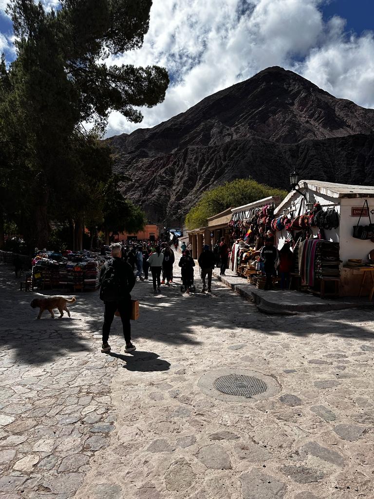 En remis, viajaron a Purmamarca como para ver otras caras, otros paisajes. Allí, la plaza tiene otro color y se encuentra adornada por puestos de artesanías que compatibilizan mejor con el entorno que los de la plaza grande de Tilcara. Todo luce más prolijo. De reojo, uno puede sentirse custodiado al observar el llamativo cerro de los siete colores y, al que uno de catorce localizado en El Hornocal, parece hacerle mella y sacarle un poco de protagonismo.